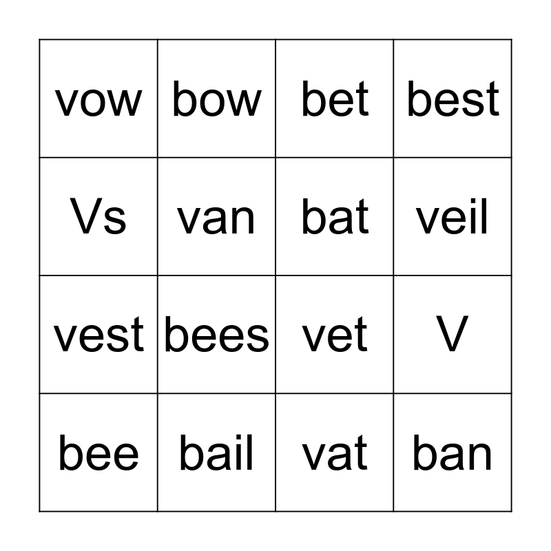 This bingo card has a free space and 15 words: bee, ban, bet, vow, veil, Vs, bees, vat, van, vest, V, best, bat, bow and bail.