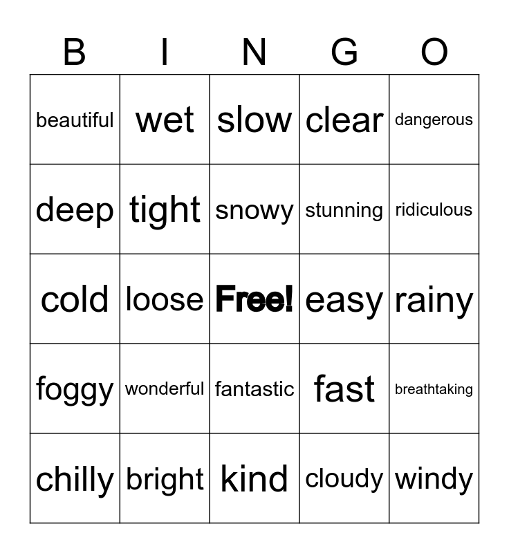 This bingo card has a free space and 24 words: wonderful, bright, snowy, chilly, dangerous, beautiful, deep, wet, easy, fantastic, stunning, cold, fast, breathtaking, tight, cloudy, rainy, slow, ridiculous, loose, windy, foggy, clear and kind.