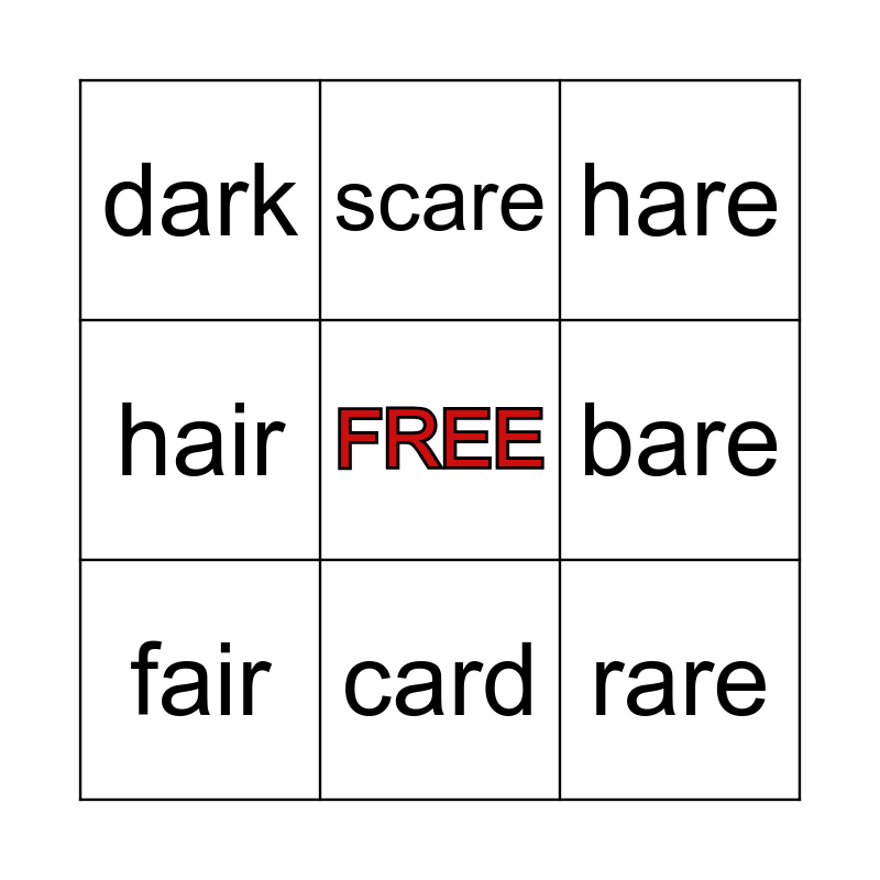 This bingo card has a free space and 14 words: bark, share, fair, scare, hair, rare, farm, yard, card, dark, start, bare, hare and pair.