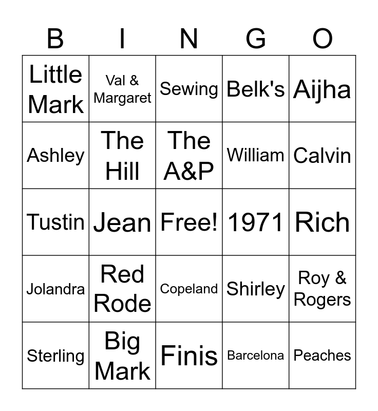 This bingo card has a free space and 44 words: Peach, Red Rode, Mt. Tabor, Barcelona, Win Dixie, The Fish Camp, The Hill, Bernardy, Belk's, Peaches, Little Mark, Big Mark, Shirley, Rich, Apricot, Crawford Brothers, Finis, 1971, Cinnabon, Tustin, Val & Margaret, Copeland, Jean Fell at Target, Aijha, Aliso Viejo, 21, The A&P, Hazel & James, Roy & Rogers, Sterling, Udanda, Sewing, Brantley, Lancaster, SC, Jolandra, Adria, Don & Stacy, Len, Calvin, Ashley, Jean, John, William and Alzora.