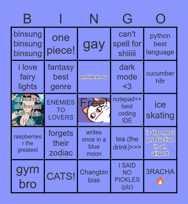 This bingo card has 1 images, a free space and 24 words: forgets their zodiac, CATS!, ambidextrous, gym bro, python best language, binsung binsung binsung, i love fairy lights, one piece!, notepad++ best coding IDE, writes once in a blue moon, dark mode <3, unhealthy obsession with robin (op), tea (the drink)>>>, is the most productive in an airport, fantasy best genre, I SAID NO PICKLES (plz), ice skating, gay, cucumber h8r, ENEMIES TO LOVERS, 3RACHA🔥, raspberries r the greatest, can't spell for shiiiii and Changbin bias.