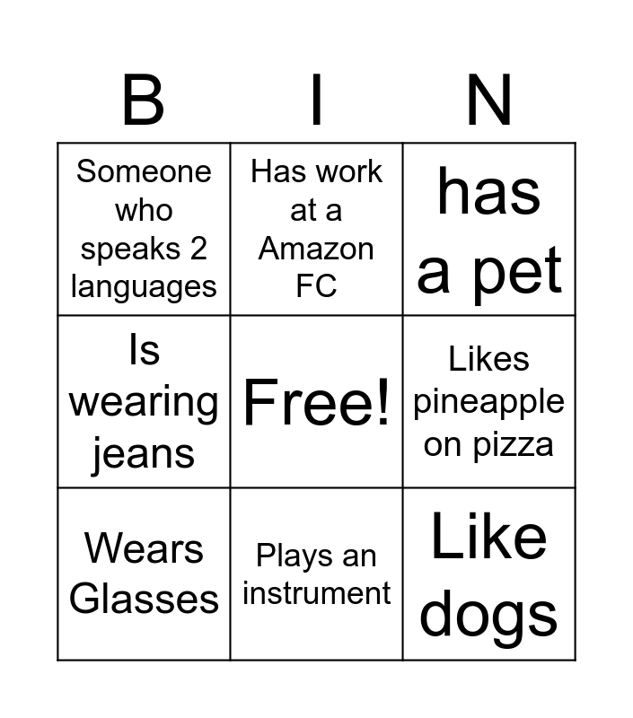 This bingo card has a free space and 14 words: Someone who has long hair, First Name starts with a B, Wears Glasses, Has work at a Amazon FC, Is wearing jeans, Like dogs, went to high school in AZ, Last name Starts with letter P, Plays an instrument, Someone who speaks 2 languages, watched Harry Potter, Likes pineapple on pizza, has a pet and has kids.