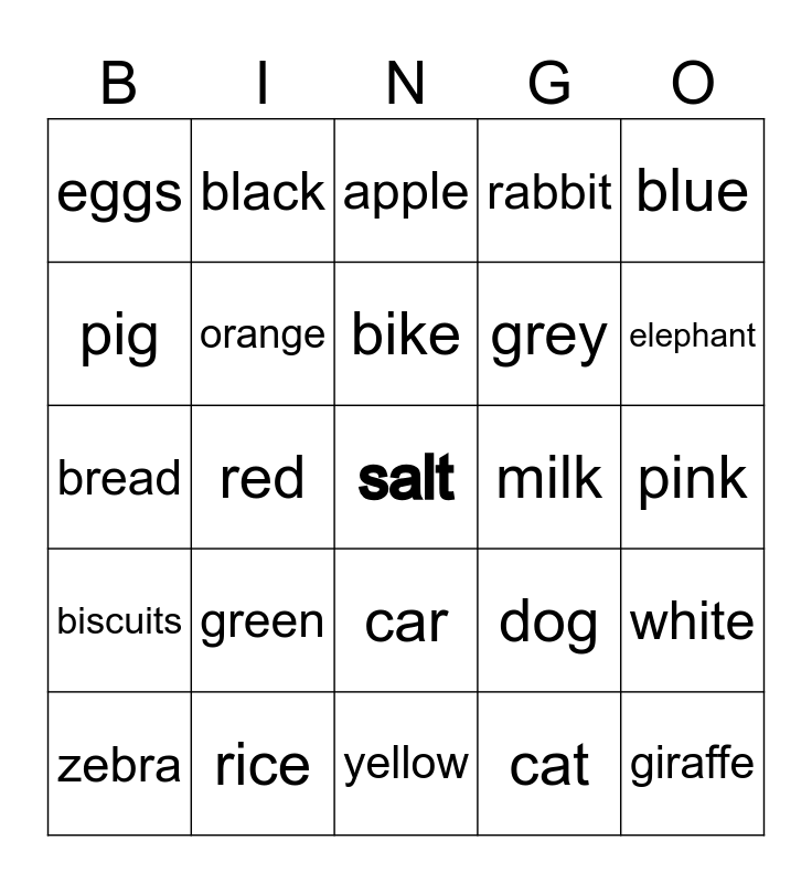 This bingo card has a free space and 24 words: green, rice, bike, zebra, blue, eggs, pig, black, milk, car, grey, bread, dog, white, orange, cat, pink, apple, elephant, red, giraffe, biscuits, rabbit and yellow.