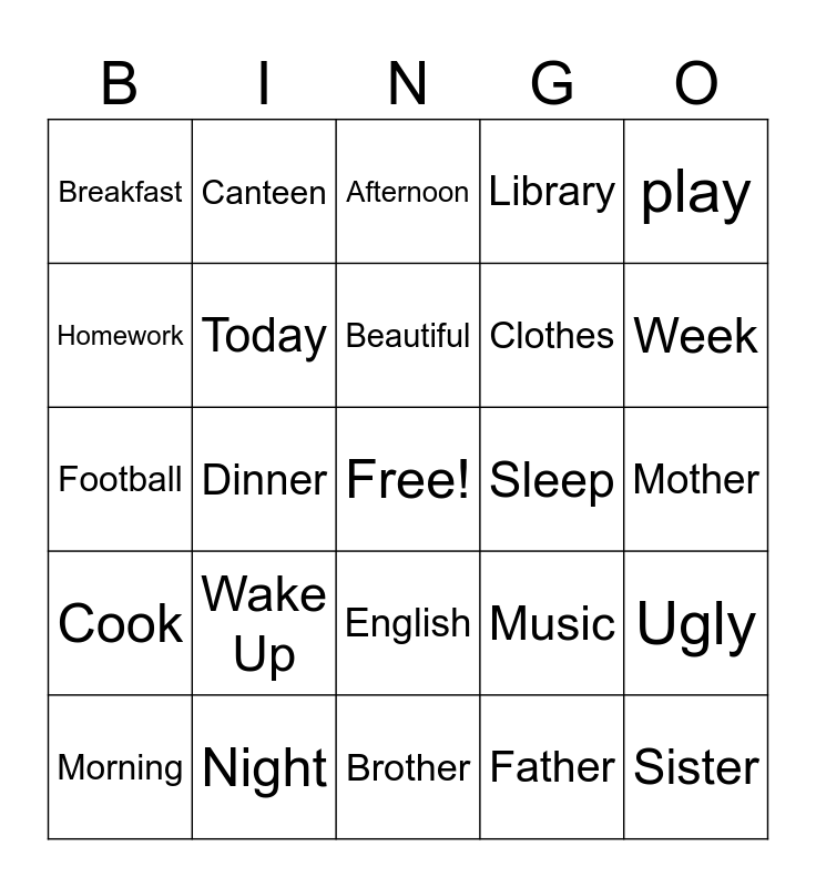 This bingo card has a free space and 29 words: Morning, Lunch, Dinner, Evening, Breakfast, Afternoon, Today, Wake Up, Sleep, Night, Mother, Sister, Brother, Father, Week, Day, English, Cook, play, Football, Music, Park, Clothes, Homework, Library, Canteen, Ugly, Beautiful and Handsome.