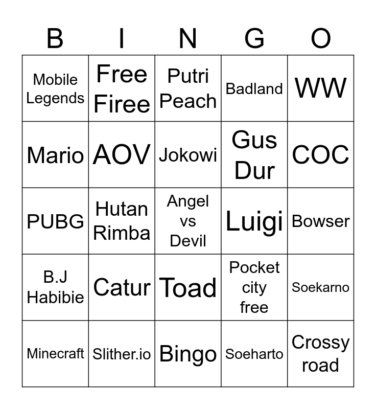 This bingo card has a free space and 24 words: Catur, Slither.io, Jokowi, Minecraft, WW, Mobile Legends, Mario, Free Firee, Luigi, Toad, Gus Dur, PUBG, Pocket city free, Soekarno, AOV, Soeharto, Bowser, Putri Peach, COC, Hutan Rimba, Crossy road, B.J Habibie, Badland and Bingo.