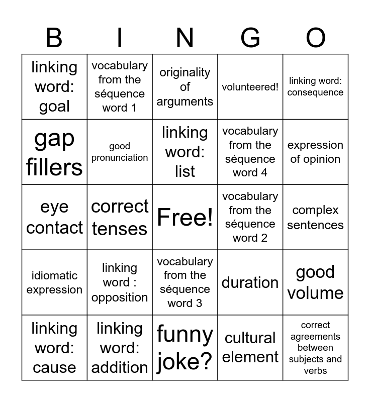 This bingo card has a free space and 24 words: linking word : opposition, linking word: addition, linking word: list, linking word: cause, linking word: consequence, linking word: goal, gap fillers, vocabulary from the séquence word 1, vocabulary from the séquence word 2, vocabulary from the séquence word 3, vocabulary from the séquence word 4, eye contact, duration, good volume, good pronunciation, cultural element, complex sentences, originality of arguments, expression of opinion, correct tenses, correct agreements between subjects and verbs, idiomatic expression, volunteered! and funny joke?.