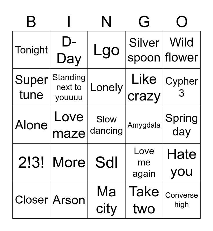 This bingo card has a free space and 24 words: More, Arson, Lonely, Closer, Wild flower, Tonight, Super tune, D-Day, Amygdala, Sdl, Like crazy, Alone, Love me again, Hate you, Standing next to youuuu, Take two, Spring day, Lgo, Cypher 3, Love maze, Converse high, 2!3!, Silver spoon and Ma city.