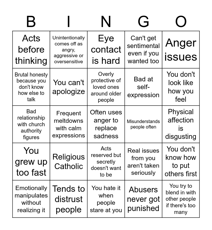 This bingo card has a free space and 24 words: Religious Catholic, Tends to distrust people, Overly protective of loved ones around older people, Emotionally manipulates without realizing it, Anger issues, Acts before thinking, Brutal honesty because you don't know how else to talk, Unintentionally comes off as angry, aggressive or oversensitive, Misunderstands people often, Acts reserved but secretly doesn't want to be, Bad at self-expression, Bad relationship with church authority figures, Real issues from you aren't taken seriously, You don't know how to put others first, You can't apologize, Abusers never got punished, Physical affection is disgusting, Eye contact is hard, You don't look like how you feel, Frequent meltdowns with calm expressions, You try to blend in with other people if there's too many, You grew up too fast, Can't get sentimental even if you wanted too and You hate it when people stare at you.
