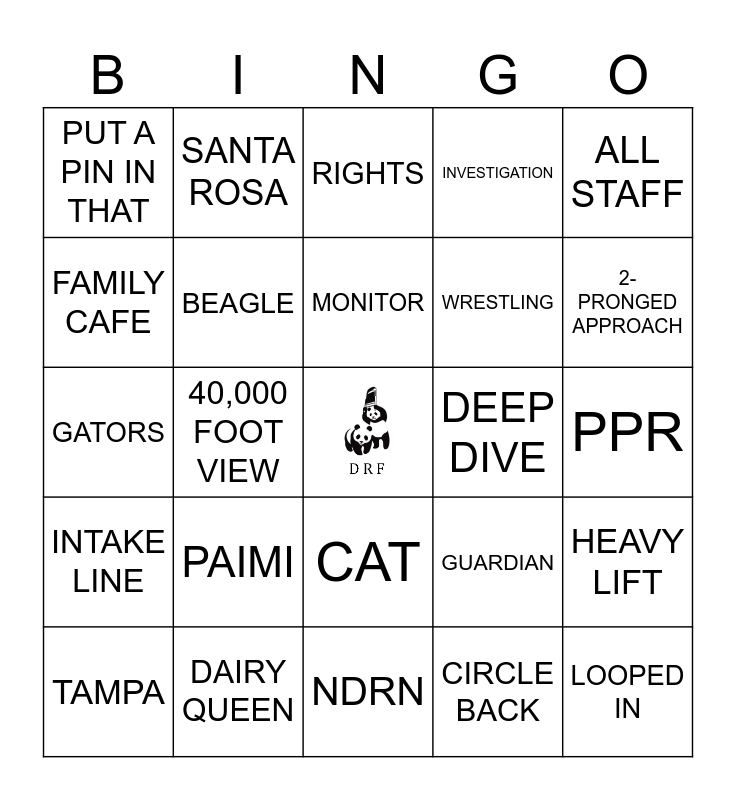 This bingo card has a free space and 24 words: PAIMI, DAIRY QUEEN, MONITOR, TAMPA, ALL STAFF, PUT A PIN IN THAT, FAMILY CAFE, SANTA ROSA, DEEP DIVE, CAT, WRESTLING, GATORS, GUARDIAN, HEAVY LIFT, BEAGLE, CIRCLE BACK, PPR, RIGHTS, 2-PRONGED APPROACH, 40,000 FOOT VIEW, LOOPED IN, INTAKE LINE, INVESTIGATION and NDRN.