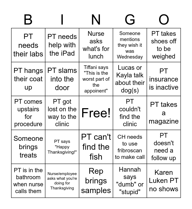This bingo card has a free space and 24 words: PT says "Happy Thanksgiving!", Nurse/employee asks what you're doing for Thanksgiving, Tiffani says "This is the worst part of the appoinent", PT is in the bathroom when nurse calls them, PT takes shoes off to be weighed, PT needs their labs, PT hangs their coat up, PT needs help with the iPad, PT couldn't find the clinic, PT can't find the fish, Lucas or Kayla talk about their dog(s), PT comes upstairs for procedure, CH needs to use fribroscan to make call, PT doesn't need a follow up, PT slams into the door, Hannah says "dumb" or "stupid", PT takes a magazine, Nurse asks what's for lunch, PT insurance is inactive, PT got lost on the way to the clinic, Karen Luken PT no shows, Someone brings treats, Someone mentions they wish it was Wednesday and Rep brings samples.