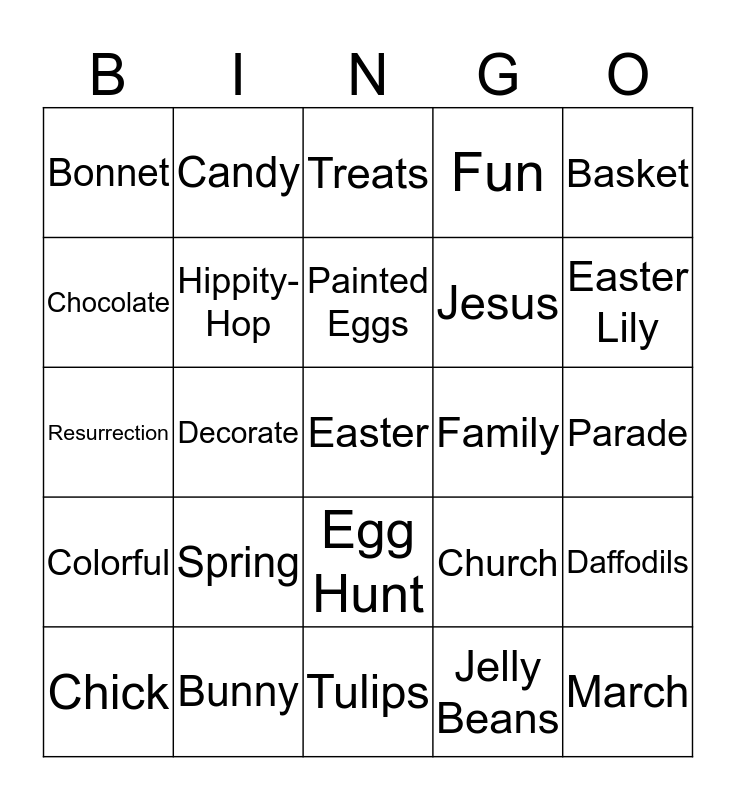 This bingo card has a free space and 24 words: Spring, Bunny, Painted Eggs, Chick, Basket, Bonnet, Chocolate, Candy, Family, Egg Hunt, Jesus, Resurrection, Church, Daffodils, Hippity-Hop, Jelly Beans, Parade, Treats, Easter Lily, Decorate, March, Colorful, Fun and Tulips.