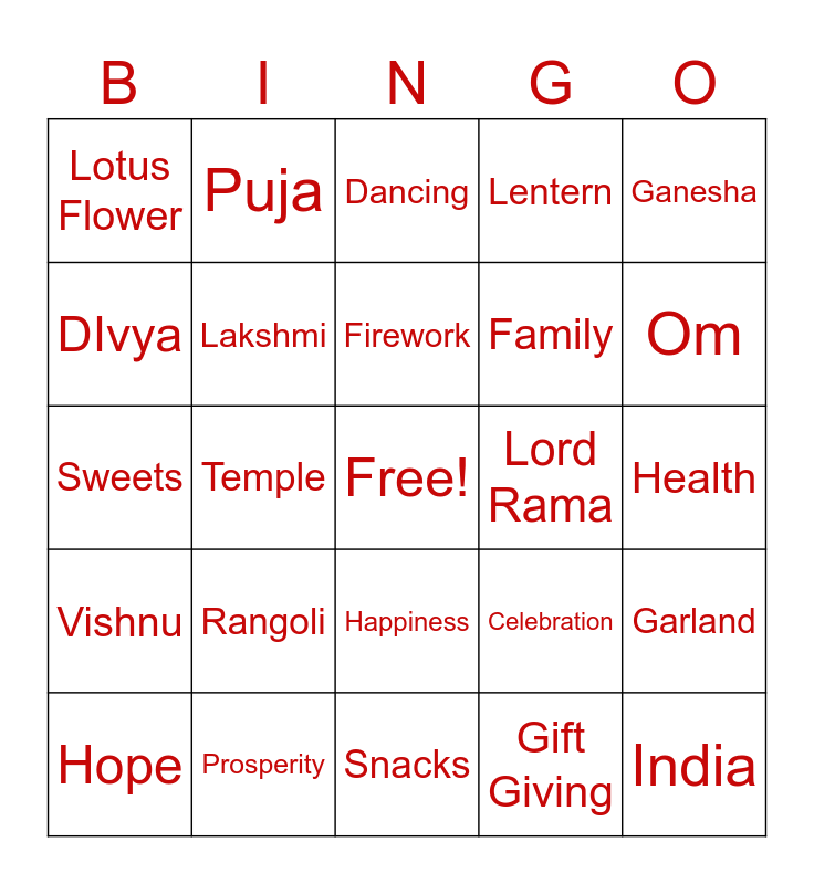 This bingo card has a free space and 24 words: Rangoli, Prosperity, Firework, Hope, Ganesha, Lotus Flower, DIvya, Puja, Lord Rama, Happiness, Family, Sweets, Celebration, Garland, Lakshmi, Gift Giving, Health, Dancing, Om, Temple, India, Vishnu, Lentern and Snacks.