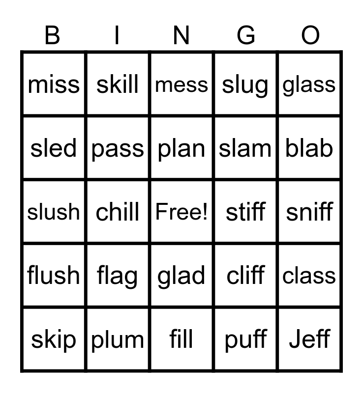 This bingo card has a free space and 31 words: fill, well, chill, hill, miss, mess, pass, cliff, stiff, puff, sniff, Jeff, puff, block, blab, clam, class, flag, flush, glad, glass, skim, skip, skill, slam, sled, slug, slush, plum, plan and plop.