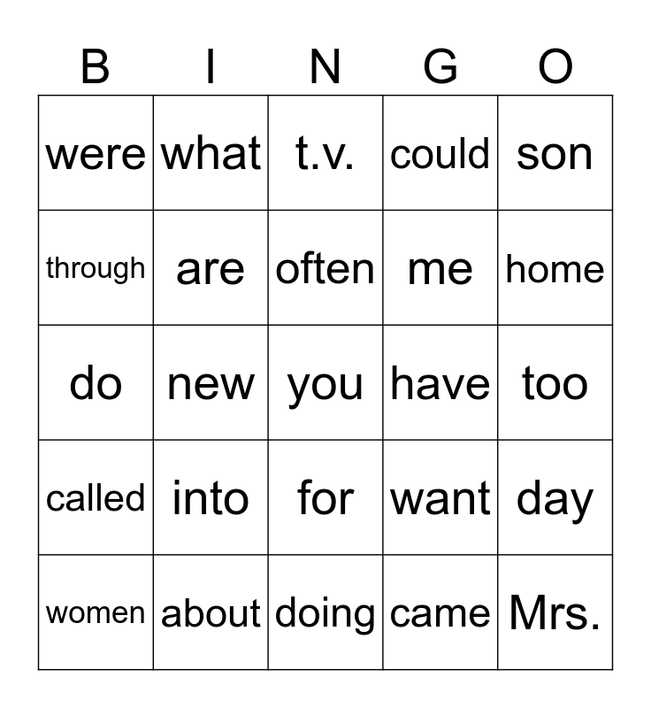 This bingo card has a free space and 25 words: into, doing, often, women, son, were, through, what, have, for, me, do, want, day, are, over, too, t.v., home, new, Mrs., about, called, could and came.
