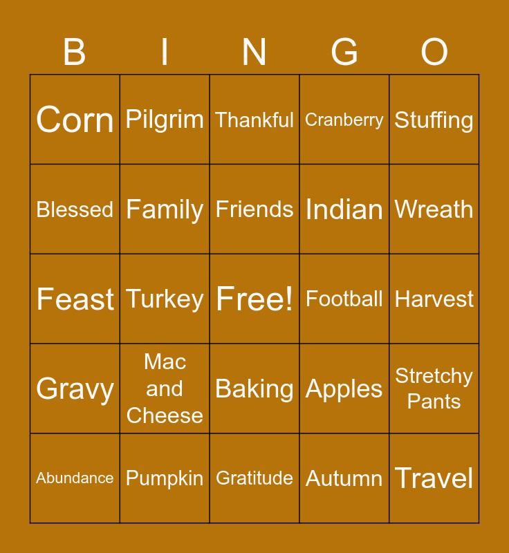 This bingo card has a free space and 30 words: Pumpkin, Pie, Turkey, Rolls, Corn, Thankful, Family, Baking, Football, Gratitude, Harvest, Travel, Autumn, Candles, Wreath, Leaves, Apples, Gravy, Mac and Cheese, Stuffing, Feast, Cornucopia, Pilgrim, Indian, Blessed, Cranberry, Stretchy Pants, Abundance, Friends and Trimmings.