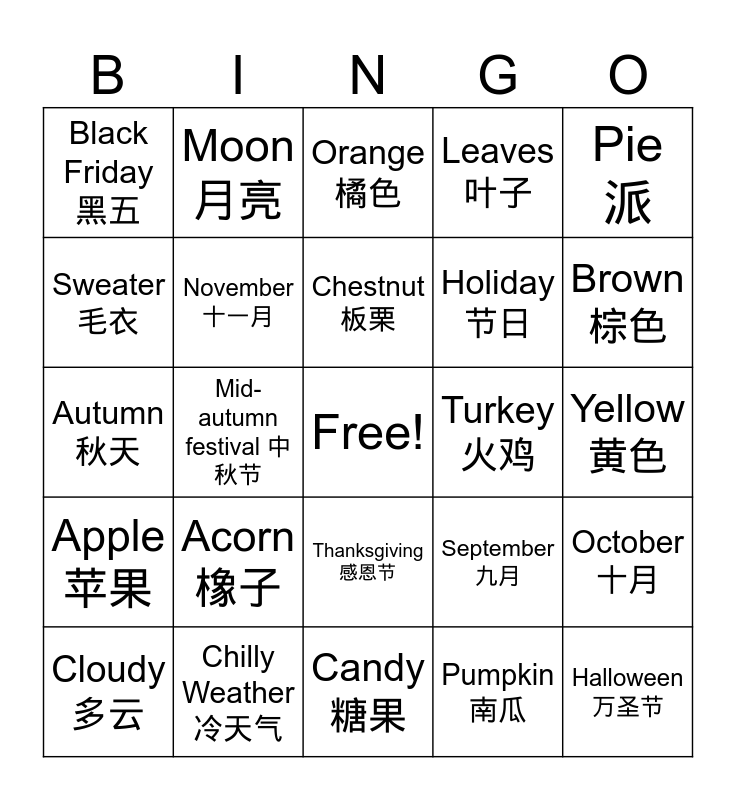 This bingo card has a free space and 25 words: Acorn 橡子, Candy 糖果, Chestnut 板栗, Cloudy 多云, Pie 派, Black Friday 黑五, Sweater 毛衣, Moon 月亮, Turkey 火鸡, Thanksgiving 感恩节, Holiday 节日, Autumn 秋天, September 九月, October 十月, November 十一月, Scarecrow 稻草人, Yellow 黄色, Orange 橘色, Brown 棕色, Mid-autumn festival 中秋节, Halloween 万圣节, Chilly Weather 冷天气, Apple 苹果, Leaves 叶子 and Pumpkin 南瓜.
