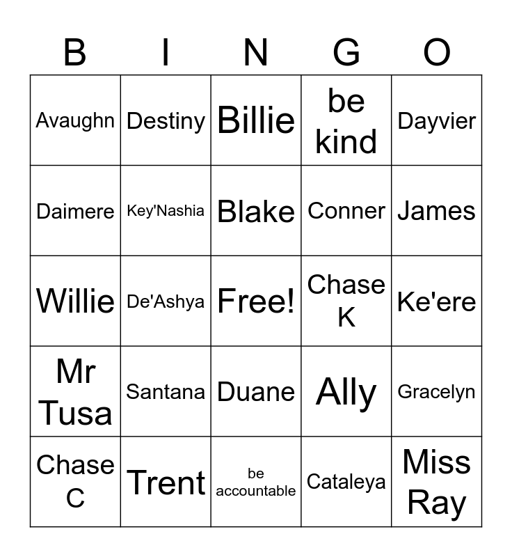 This bingo card has a free space and 24 words: Santana, Trent, Blake, Chase C, Dayvier, Avaughn, Daimere, Destiny, Chase K, Duane, Conner, Willie, Ally, Gracelyn, Key'Nashia, Cataleya, Ke'ere, Billie, James, De'Ashya, Miss Ray, Mr Tusa, be kind and be accountable.