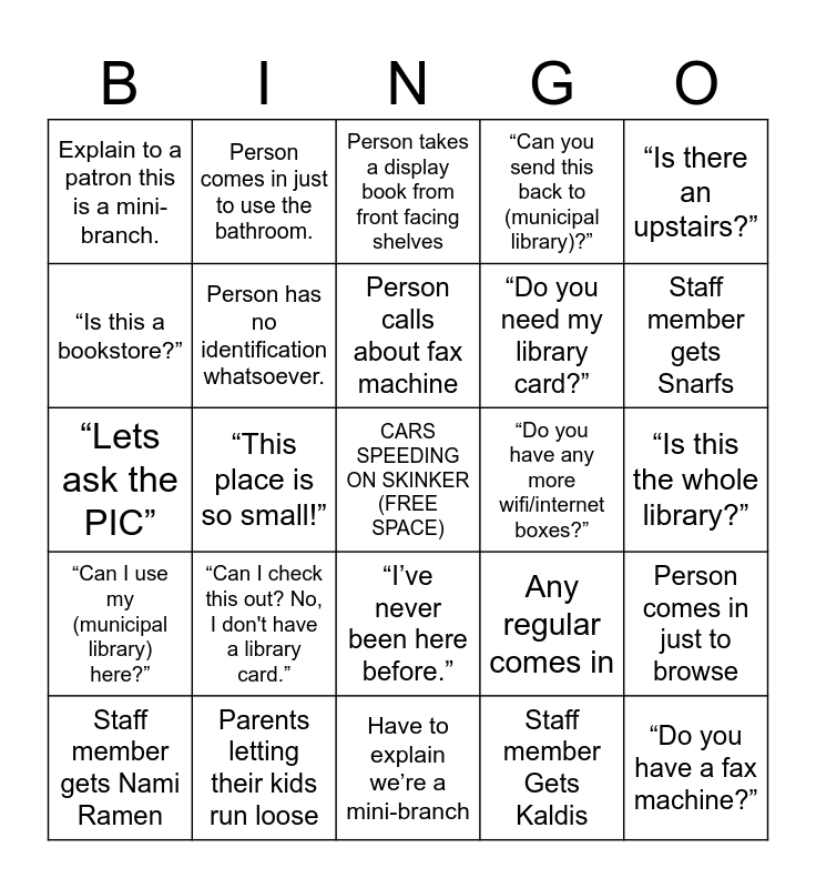 This bingo card has a free space and 63 words: Person calls to ask where we are, Person needs a Notary, Person asks about hours, Person comes in just to browse, Person comes in just to use the printer, Person comes in just to use computer, Person comes in just to use the bathroom., Person calls about computer, Person calls about fax machine, Person calls about printer, “I’ve never been here before.”, “Just browsing/looking around.”, “Is this the whole library?”, “Is there an upstairs?”, “Is there a place I can study here?”, “Is this a bookstore?”, “This place is so small!”, Explain to a patron this is a mini-branch., Eye contact with pedestrians looking in windows, “Do you need my library card?”, “Can I check this out? No, I don't have a library card.”, “Can I use my (municipal library) here?”, “Can you send this back to (municipal library)?”, Person thinks we are affiliated with municipal libraries, Someone from Wash U calls, Google robocall, Phone rings, we answer, *silence*, Referring folks to Schlafly, Referring folks to Central, Patron that comes in only to pick up holds, Patron takes their own holds off shelf, Person tries to search web on catalog computer, “Unfortunately we don't have/can’t do this at this library.”, Hear cars honking a each other, Staff member gets Snarfs, Staff member gets Nami Ramen, Staff member Gets Kimchi Guys, Staff member Gets Kaldis, Staff member gets Starbucks, Person has no identification whatsoever., “Lets ask the PIC”, “Do you have any more wifi/internet boxes?”, “Do you have any laptops?, “Can I take this out the window?”, “Do you have a fax machine?”, Parents letting their kids run loose, “I used to work for the library.”, Any regular comes in, Wash U student comes in, Someone comments on three people behind the desk, “Where’s the man that used to be here?” (Stephen), Have to explain we’re a mini-branch, Don’t have certain books customer ask about, Find a double copy of book/library item, Person tries to come in wrong door, Person takes a display book from front facing shelves, Person takes display book from Adult fiction, Person takes display media, Person take new fiction book, Person takes a Hot Pick, Person takes display item on reg. Shelves, Person took themed display and Watch someone put books in the book drop.