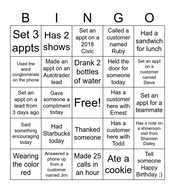 This bingo card has a free space and 24 words: Wearing the color red, Had Starbucks today, Drank 2 bottles of water, Ate a cookie, Had a sandwich for lunch, Set 3 appts, Has 2 shows, Set an appt on a 2018 Civic, Has a customer here with Ernest, Set an appt for a teammate, Set an appt on a lead from 3 days ago, Made an appt on an Autotrader lead, Has a customer here with Todd, Has a note on a showroom visit from Shannon Dailey, Used the word conglomerate on the phone, Answered a phone up from a customer named Jim, Made 25 calls in an hour, Called a customer named Ruby, Set an appt on a customer named Steve, Said something encouraging today, Gave someone a compliment today, Thanked someone, Held the door for someone today and Tell someone Happy Birthday :).