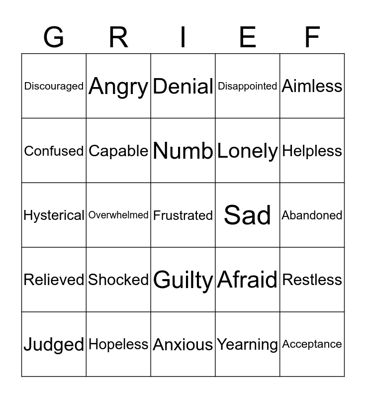 This bingo card has 25 words: Shocked, Anxious, Numb, Judged, Aimless, Discouraged, Confused, Angry, Sad, Guilty, Lonely, Hysterical, Afraid, Restless, Capable, Acceptance, Abandoned, Denial, Helpless, Overwhelmed, Frustrated, Hopeless, Relieved, Disappointed and Yearning.