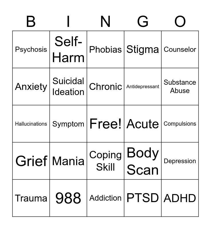 This bingo card has a free space and 24 words: Mania, 988, Chronic, Trauma, Counselor, Psychosis, Anxiety, Self-Harm, Acute, Coping Skill, Antidepressant, Hallucinations, Body Scan, Depression, Suicidal Ideation, PTSD, Compulsions, Phobias, Substance Abuse, Symptom, ADHD, Grief, Stigma and Addiction.