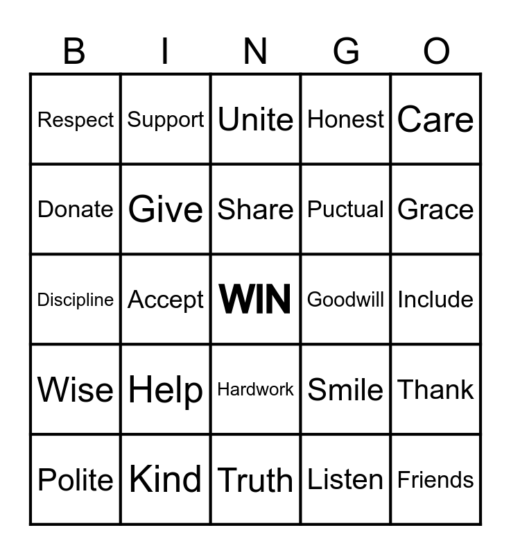 This bingo card has a free space and 24 words: Help, Kind, Share, Polite, Care, Respect, Donate, Support, Goodwill, Hardwork, Puctual, Discipline, Smile, Thank, Give, Listen, Include, Unite, Grace, Accept, Friends, Wise, Honest and Truth.