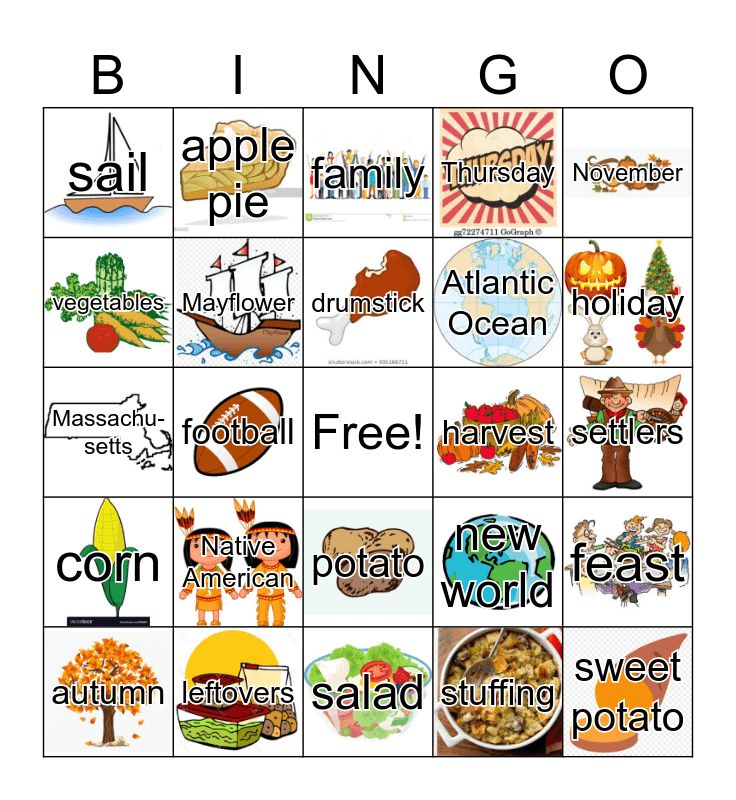 This bingo card has 34 images, a free space and 34 words: turkey, stuffing, pilgrim, cranberry sauce, corn, Mayflower, November, autumn, apple pie, pumpkin, drumstick, family, gobble, gratitude, harvest, holiday, leftovers, Massachu-setts, Native American, new world, potato, Plymouth Rock, sail, settlers, salad, sweet potato, Thursday, yam, Atlantic Ocean, vegetables, changing leaves, football, feast and tradition.