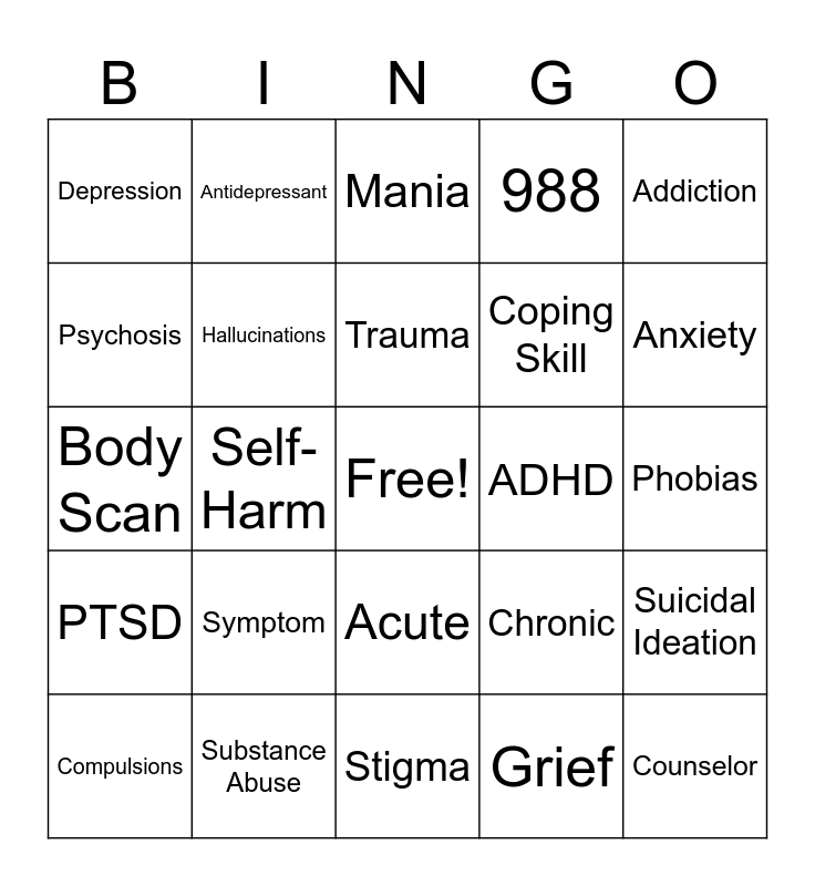 This bingo card has a free space and 24 words: Symptom, Substance Abuse, Trauma, Compulsions, Addiction, Depression, Psychosis, Antidepressant, ADHD, Acute, Coping Skill, Body Scan, Chronic, Suicidal Ideation, Hallucinations, Grief, Phobias, Mania, Anxiety, Self-Harm, Counselor, PTSD, 988 and Stigma.