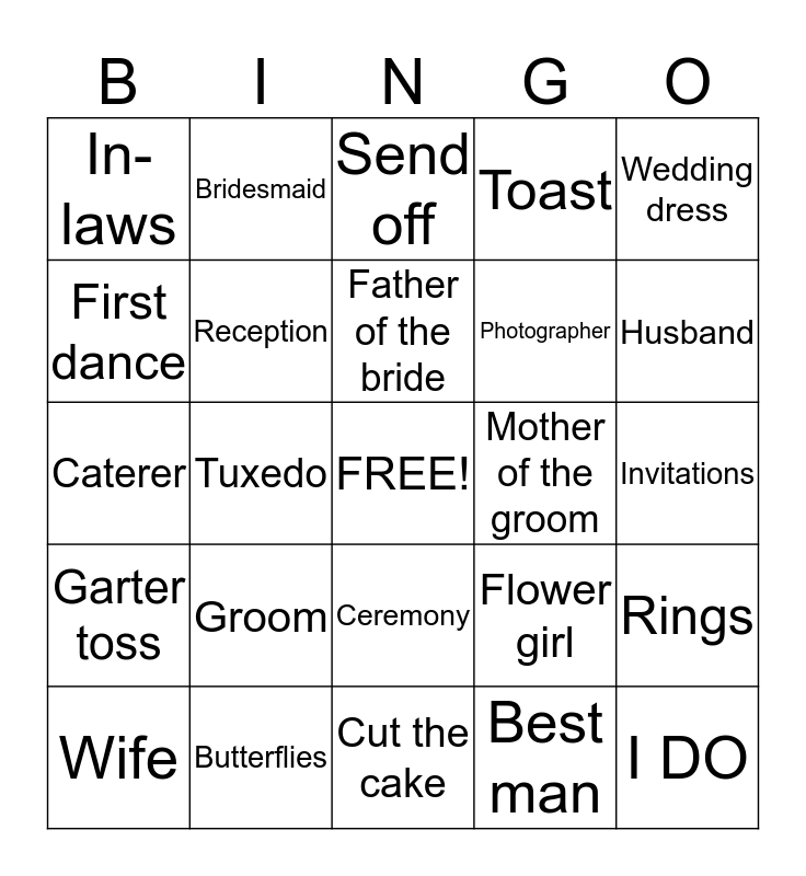 This bingo card has a free space and 47 words: Love, I DO, Honeymoon, Cut the cake, Groom, Bride, Bridesmaid, Maid of honor, First dance, Vows, Reception, Toast, Rings, Flower girl, Ring bearer, Mother of the bride, Father of the bride, Mother of the groom, Father of the groom, Wedding dress, Tuxedo, Best man, In-laws, Photographer, Veil, Husband, Wife, Kiss the bride, Ceremony, Garter toss, Ashley, Jamie, March 23, 2013, Favors, Guest book, Butterflies, Invitations, DJ, RSVP, Byron, GA, Rehersal dinner, Send off, Caterer, Flowers, Aisle, Give away the bride and Bridal shower.