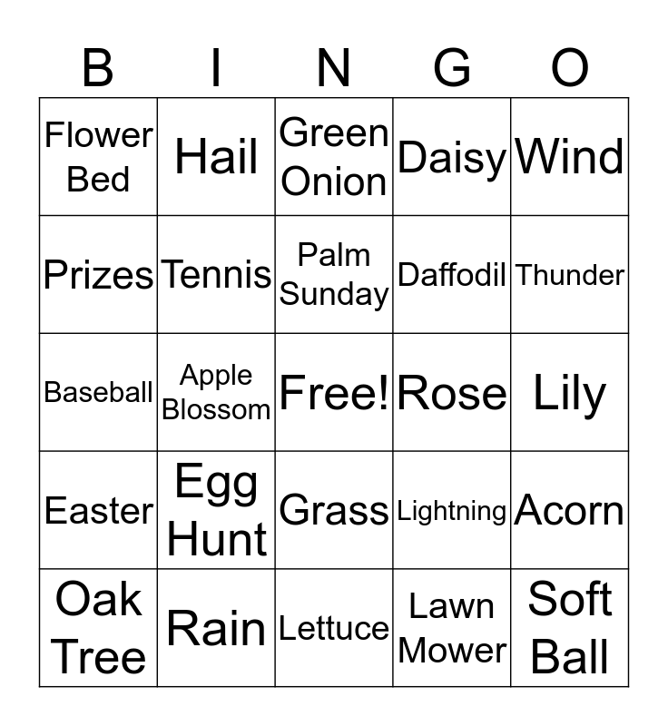 This bingo card has a free space and 24 words: Egg Hunt, Rain, Palm Sunday, Oak Tree, Wind, Flower Bed, Prizes, Hail, Rose, Grass, Daffodil, Baseball, Lightning, Acorn, Tennis, Lawn Mower, Lily, Green Onion, Thunder, Apple Blossom, Soft Ball, Easter, Daisy and Lettuce.