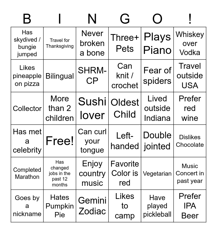 This bingo card has 36 words: Favorite Color is red, Enjoy country music, Likes to camp, Likes pineapple on pizza, Has met a celebrity, Oldest Child, Bilingual, Gemini Zodiac, Plays Piano, Vegetarian, Travel outside USA, Three+ Pets, Music Concert in past year, More than 2 children, Can knit / crochet, Has skydived / bungie jumped, Completed Marathon, Lived outside Indiana, Collector, Never broken a bone, Sushi lover, Free!, Left-handed, Can curl your tongue, Double jointed, Travel for Thanksgiving, Fear of spiders, Hates Pumpkin Pie, SHRM-CP, Whiskey over Vodka, Prefer IPA Beer, Goes by a nickname, Dislikes Chocolate, Prefer red wine, Has changed jobs in the past 12 months and Have played pickleball.
