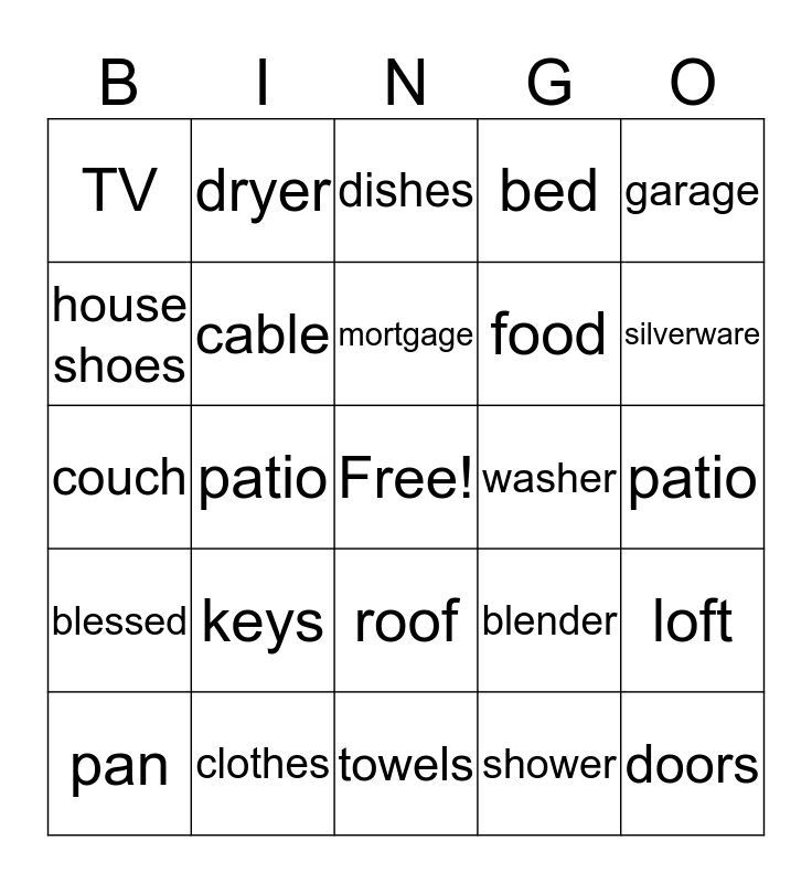 This bingo card has a free space and 24 words: keys, clothes, mortgage, pan, garage, TV, house shoes, dryer, washer, roof, food, couch, blender, loft, cable, shower, patio, dishes, silverware, patio, doors, blessed, bed and towels.