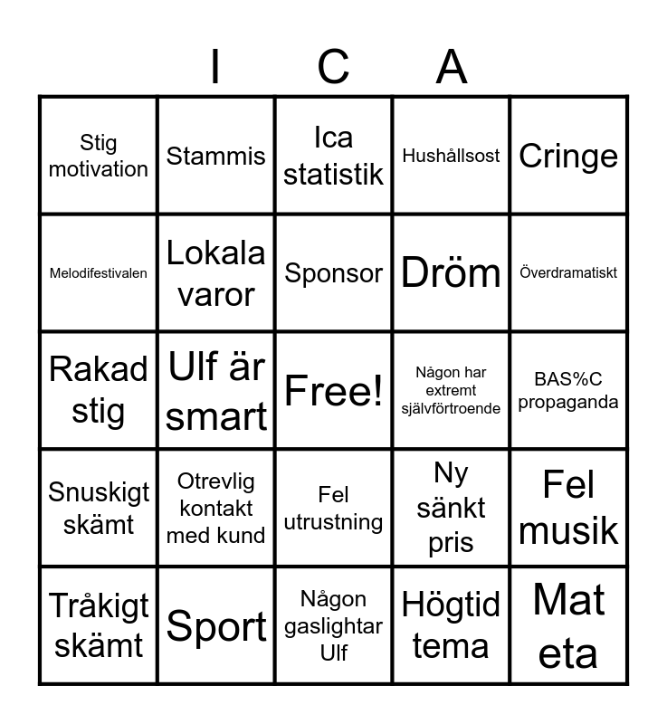 This bingo card has a free space and 31 words: Någon gaslightar Ulf, Ulf gör nåt idiotiskt, Ulf är smart, Jerry är smart, Stig motivation, Ica statistik, Lokala varor, Ny sänkt pris, Någon har extremt självförtroende, Högtid tema, BAS%C propaganda, Mat eta, Gay beteende av Sebbe, Stig ställer allt till rätta, Överdramatiskt, Cinematiskt, Fel musik, Otrevlig kontakt med kund, Snuskigt skämt, Fel utrustning, Cringe, Jerry är en giga chad, Tråkigt skämt, Stammis, Dröm, Melodifestivalen, Hushållsost, Rakad stig, Sport, Sponsor and Barn och skola.