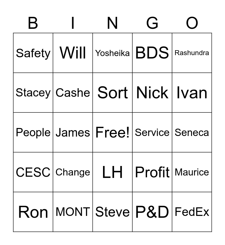 This bingo card has a free space and 24 words: Ron, Change, Sort, P&D, Rashundra, Safety, Will, Yosheika, Service, Seneca, People, Cashe, Profit, Maurice, Stacey, MONT, Steve, BDS, Ivan, CESC, James, LH, Nick and FedEx.