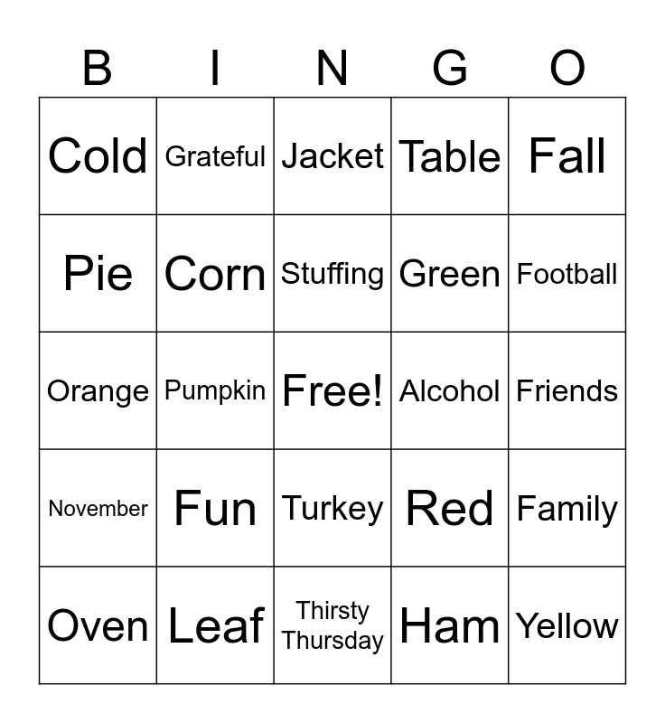 This bingo card has a free space and 26 words: Turkey, Ham, Stuffing, Leaf, Fall, Cold, Pie, Grateful, Friends, Red, Green, Orange, Family, Oven, Pumpkin, Apple, Table, November, Jacket, Yellow, Football, Thirsty Thursday, Alcohol, Fun, Corn and Snoopy.