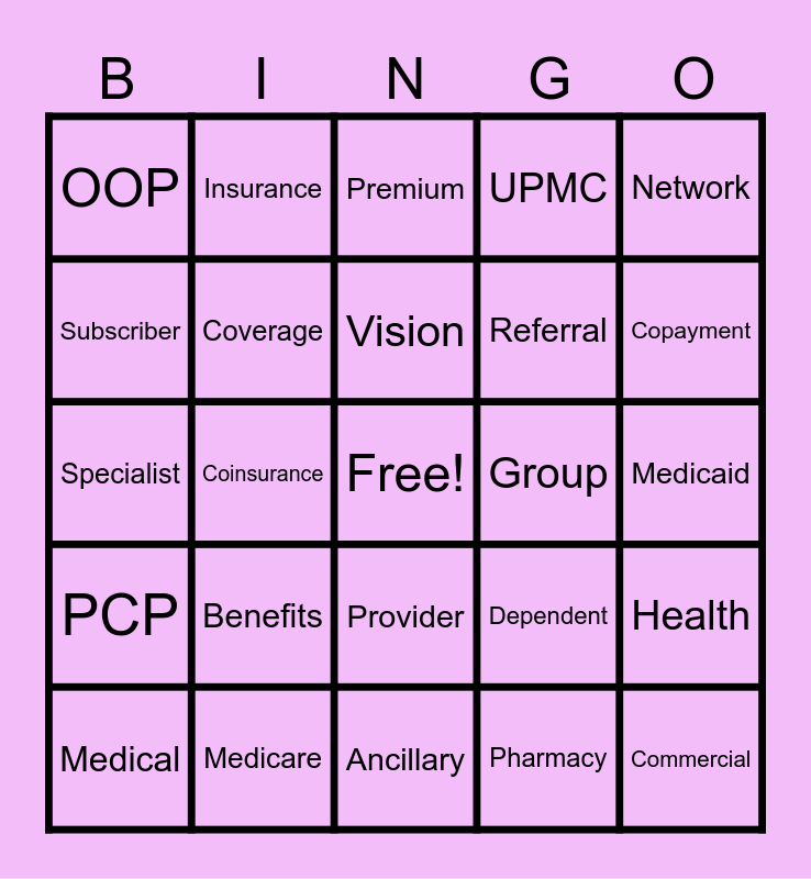 This bingo card has a free space and 29 words: Medical, Authorization, Coinsurance, Deductible, OOP, Premium, Coverage, Benefits, Group, Medicare, Medicaid, Commercial, Ancillary, Pharmacy, Copayment, CHIP, Provider, PCP, Network, Specialist, Dependent, Claim, Referral, Subscriber, UPMC, Insurance, Health, Vision and Dental.