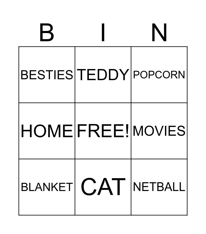 This bingo card has a free space and 8 words: MOVIES, POPCORN, TEDDY, BLANKET, BESTIES, NETBALL, HOME and CAT.