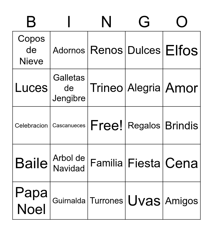 This bingo card has a free space and 24 words: Arbol de Navidad, Guirnalda, Trineo, Papa Noel, Elfos, Copos de Nieve, Luces, Adornos, Regalos, Familia, Alegria, Celebracion, Fiesta, Cena, Galletas de Jengibre, Uvas, Brindis, Renos, Amor, Cascanueces, Amigos, Baile, Dulces and Turrones.