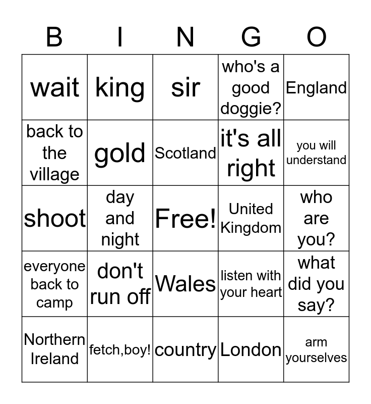 This bingo card has a free space and 24 words: don't run off, fetch,boy!, Scotland, Northern Ireland, England, wait, back to the village, king, United Kingdom, Wales, it's all right, shoot, listen with your heart, what did you say?, gold, London, who are you?, sir, you will understand, day and night, arm yourselves, everyone back to camp, who's a good doggie? and country.