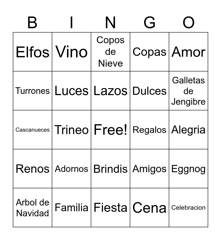 This bingo card has a free space and 29 words: Arbol de Navidad, Guirnalda, Trineo, Papa Noel, Elfos, Copos de Nieve, Luces, Adornos, Regalos, Familia, Alegria, Celebracion, Fiesta, Cena, Galletas de Jengibre, Uvas, Brindis, Renos, Amor, Cascanueces, Amigos, Baile, Dulces, Turrones, Copas, Vino, Eggnog, Lazos and Pino.