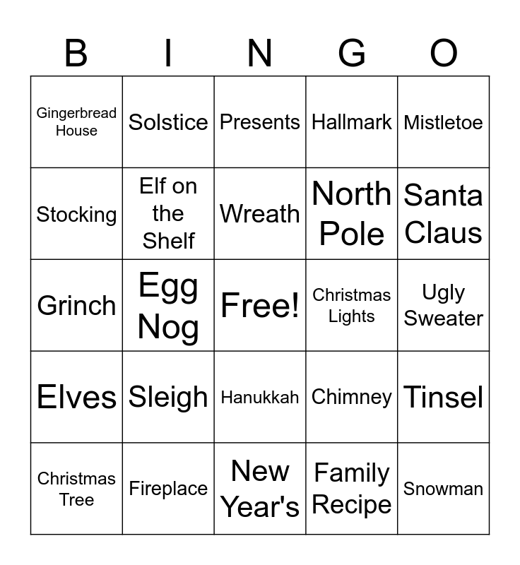 This bingo card has a free space and 29 words: Christmas Tree, Hot Cocoa, Egg Nog, Snow, Gingerbread House, Presents, Elf on the Shelf, Sleigh, Christmas Lights, Fireplace, Ugly Sweater, Snowman, New Year's, Family Recipe, Santa Claus, Christmas Carol, Hanukkah, Elves, Mistletoe, Grinch, Chimney, Mittens, North Pole, Stocking, Hallmark, Solstice, Tinsel, Wreath and Nutcracker.