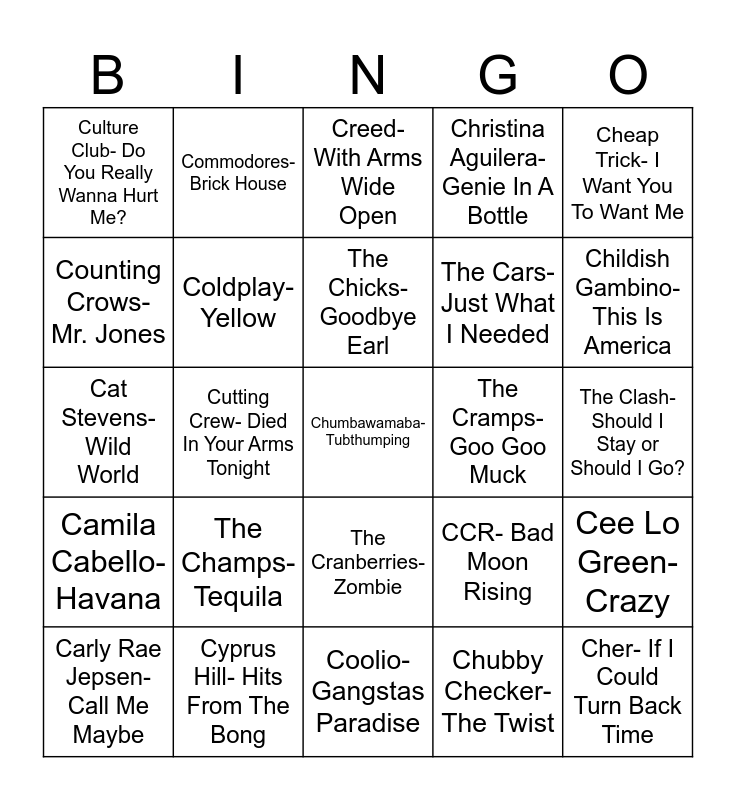 This bingo card has 30 words: Cyprus Hill- Hits From The Bong, Cyndi Lauper- Girls Just Wanna Have Fun, Cutting Crew- Died In Your Arms Tonight, The Cure- Just Like Heaven, Culture Club- Do You Really Wanna Hurt Me?, Creed- With Arms Wide Open, Coldplay- Yellow, The Cranberries- Zombie, The Cramps- Goo Goo Muck, Coolio- Gangstas Paradise, The Clash- Should I Stay or Should I Go?, Chumbawamaba- Tubthumping, Chubby Checker- The Twist, Cher- If I Could Turn Back Time, Childish Gambino- This Is America, Cake- The Distance, CCR- Bad Moon Rising, Camila Cabello- Havana, The Champs- Tequila, Cheap Trick- I Want You To Want Me, Cat Stevens- Wild World, Chuck Berry- Johnny B. Good, Commodores- Brick House, The Cars- Just What I Needed, Counting Crows- Mr. Jones, Christina Aguilera- Genie In A Bottle, Cee Lo Green- Crazy, Carly Rae Jepsen- Call Me Maybe, The Chicks- Goodbye Earl and Cardi B- I Like It.