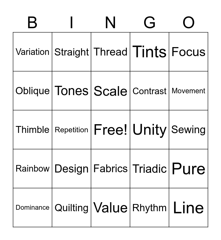 This bingo card has a free space and 47 words: Shape, Line, Color, Value, Design, Curve, Straight, Diagonal, Oblique, Shades, Tones, Tints, Pure, Triadic, Texture, Proportion, Scale, Unity, Balance, Focus, Repetition, Rhythm, Variation, Contrast, Proximity, Movement, Dominance, Collage, Fabrics, Rainbow, Color wheel, Red, Blue, Yellow, Quilts, Quilting, Sewing, Piecing, Scissors, Sewing machine, Sean ripper, Thread, Thimble, Bias, Rotary cutter, Chalk marker and Fabric glue.