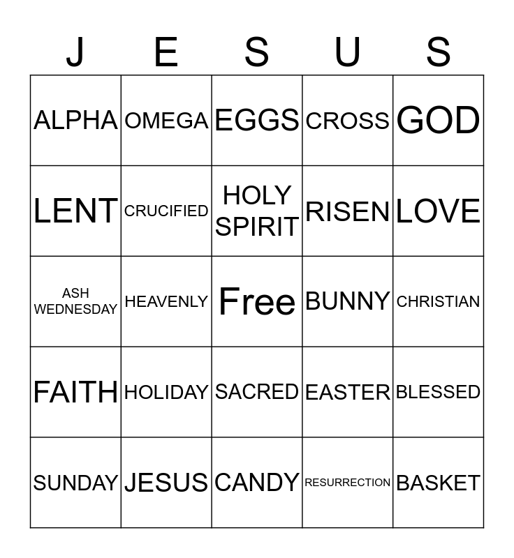 This bingo card has a free space and 24 words: HOLIDAY, JESUS, HOLY SPIRIT, SUNDAY, GOD, ALPHA, LENT, OMEGA, BUNNY, SACRED, RISEN, ASH WEDNESDAY, EASTER, BLESSED, CRUCIFIED, RESURRECTION, CHRISTIAN, EGGS, LOVE, HEAVENLY, BASKET, FAITH, CROSS and CANDY.