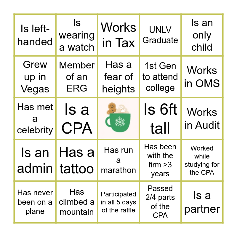 This bingo card has a free space and 24 words: Has a tattoo, Has climbed a mountain, Has a fear of heights, Has never been on a plane, Is an only child, Is left-handed, Grew up in Vegas, Is wearing a watch, Is 6ft tall, Has run a marathon, 1st Gen to attend college, Has met a celebrity, Has been with the firm >3 years, Worked while studying for the CPA, Member of an ERG, Passed 2/4 parts of the CPA, Works in Audit, Works in Tax, Works in OMS, Is a CPA, Is a partner, Is an admin, UNLV Graduate and Participated in all 5 days of the raffle.