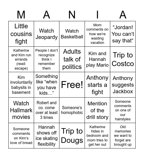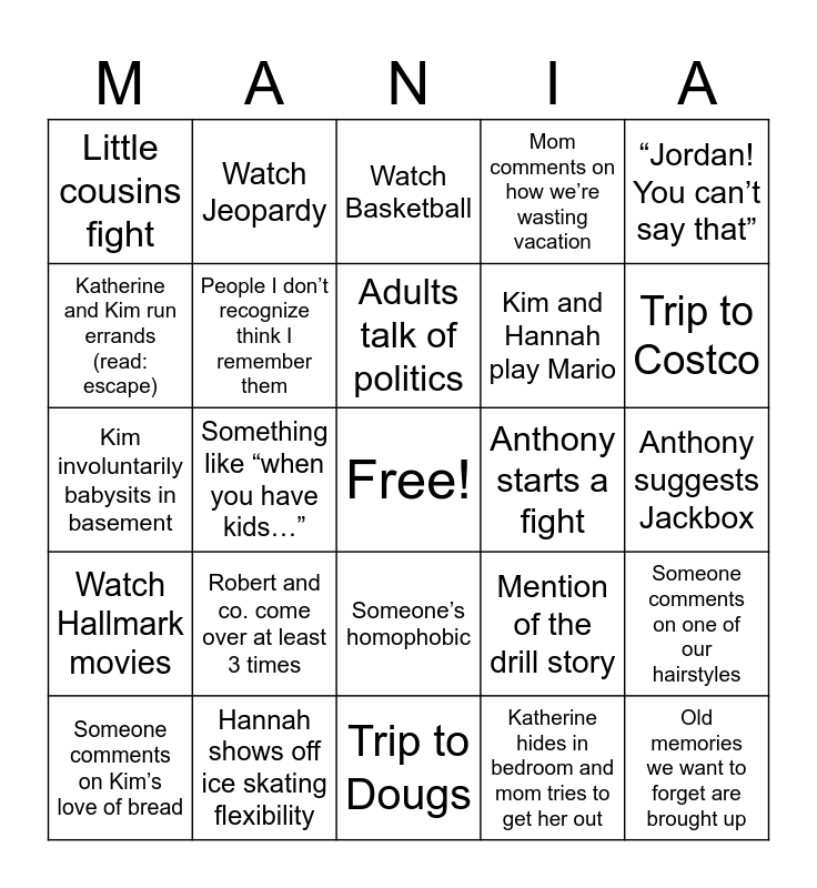 This bingo card has a free space and 28 words: Someone comments on one of our hairstyles, Jordan shows up and leaves after 5 minutes, Kim and Hannah play Mario, Katherine hides in bedroom and mom tries to get her out, Katherine and Kim run errands (read: escape), Watch Basketball, Watch Jeopardy, Watch Hallmark movies, Anthony starts a fight, Someone comments on Kim’s love of bread, Kim involuntarily babysits in basement, Mom comments on how we’re wasting vacation, Hannah shows off ice skating flexibility, Trip to Dougs, Trip to Costco, At least 3 people try to give college advice, Robert and co. come over at least 3 times, People I don’t recognize think I remember them, Adults talk of politics, Someone’s homophobic, Little cousins fight, “When I was your age…”, Old memories we want to forget are brought up, Something like “when you have kids…”, Anthony suggests Jackbox, Mention of the drill story, “Jordan! You can’t say that” and Someone gets very noticeable “iffy” about Megan’s pregnancy.