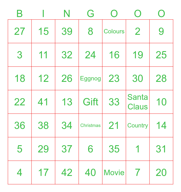 This bingo card has 49 words: 1, 19, Movie, 41, 26, 10, 15, 42, 2, Christmas, 9, 8, 30, 23, 29, Santa Claus, 3, 25, 31, Colours, 16, 13, 27, 11, 4, 32, 28, 17, Eggnog, 12, 20, 33, 5, 37, 22, 21, Country, 14, 18, 34, 6, 36, Gift, 40, 24, 39, 35, 38 and 7.