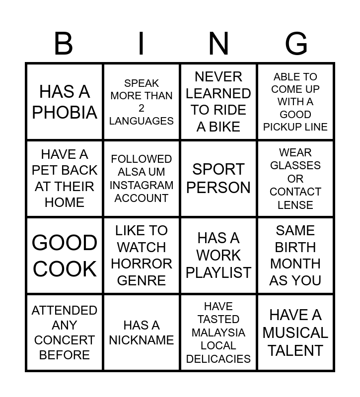 This bingo card has 16 words: HAS A NICKNAME, SAME BIRTH MONTH AS YOU, NEVER LEARNED TO RIDE A BIKE, HAS A PHOBIA, GOOD COOK, SPEAK MORE THAN 2 LANGUAGES, HAS A WORK PLAYLIST, HAVE TASTED MALAYSIA LOCAL DELICACIES, HAVE A PET BACK AT THEIR HOME, FOLLOWED ALSA UM INSTAGRAM ACCOUNT, ATTENDED ANY CONCERT BEFORE, ABLE TO COME UP WITH A GOOD PICKUP LINE, LIKE TO WATCH HORROR GENRE, WEAR GLASSES OR CONTACT LENSE, SPORT PERSON and HAVE A MUSICAL TALENT.