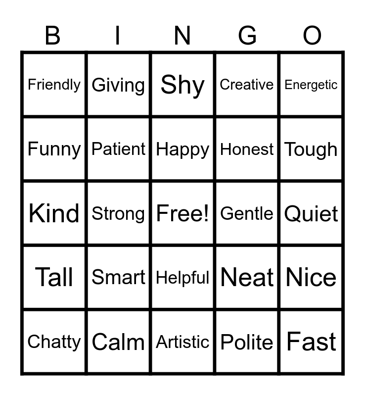 This bingo card has a free space and 24 words: Smart, Calm, Happy, Chatty, Energetic, Friendly, Funny, Giving, Gentle, Helpful, Honest, Kind, Neat, Nice, Patient, Polite, Quiet, Shy, Tough, Strong, Fast, Tall, Creative and Artistic.
