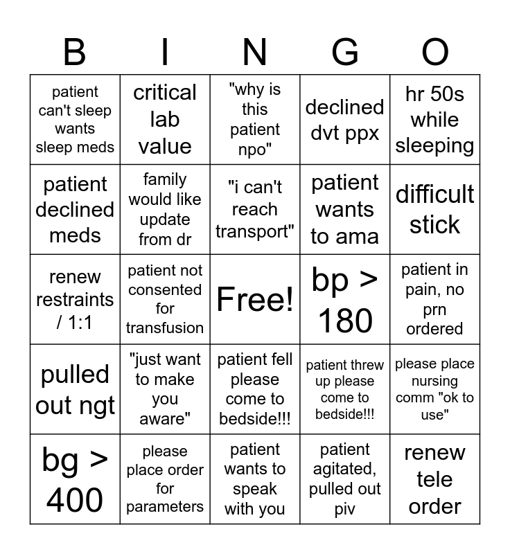 This bingo card has a free space and 24 words: "just want to make you aware", please place order for parameters, "i can't reach transport", bg > 400, hr 50s while sleeping, patient can't sleep wants sleep meds, patient declined meds, critical lab value, bp > 180, patient fell please come to bedside!!!, patient wants to ama, renew restraints / 1:1, patient threw up please come to bedside!!!, please place nursing comm "ok to use", family would like update from dr, patient agitated, pulled out piv, patient in pain, no prn ordered, "why is this patient npo", difficult stick, patient not consented for transfusion, renew tele order, pulled out ngt, declined dvt ppx and patient wants to speak with you.